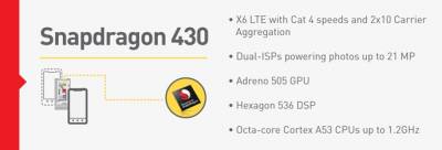 Интегрированный сотовый модем LTE Cat 7 позволяет осуществлять загрузку данных в сетях четвёртого поколения со скоростью до 300 Мбит / с. Изделие Snapdragon 430, в свою очередь, объединяет восемь ядер ARM Cortex A53 с тактовой частотой до 1,2 ГГц и графический ускоритель Adreno 505 с поддержкой OpenGL ES 3.1 +.